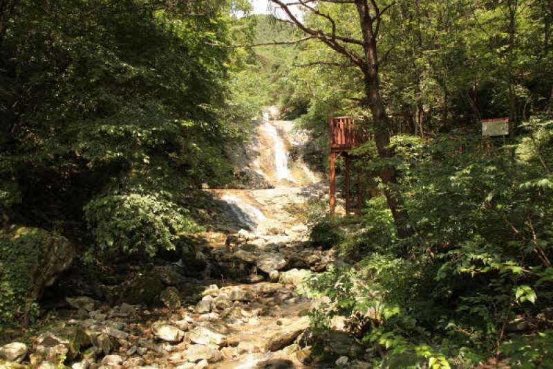 넓은 진달래꽃밭이 장관을 이루는 보련산에 있는 폭포다. 정상에서 남동쪽으로 내려오는 길에 자리하고 있다. 주위 자연경관이 아름답고 물이 맑아서 여름철 많은 사람들이 찾아오고 있다. 약 6m높이의 폭포로 수직 폭포는 아니지만 화강암질편마암으로 이루어진 넓적한 바위위에서 3층의 단을 이우며 물줄기가 떨어진다. 주변의 푸른 숲과 어우러져 시원함을 느끼게 한다. 물이 맑고 수량이 맑아서 보련산 등반과 연계한 여름철 휴양지로 알려져 있다. 가까운 곳에 앙성온천지구와 보련산성 등 가볼만한 명소가 있다.