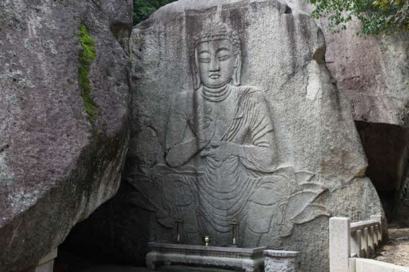 법주사는 신라 진흥왕 때 창건한 사찰로 미륵신앙의 중심도량이다. 법주사 경내에 있는 마애여래의상은 높이가 6미터나 되는 바위에 돋을새김으로 조각된 고려시대의 석불이다. 의자에 앉아있는 모습으로 옆 바위에 조각된 지장보살과 함께 법주사의 성격을 알려주는 미륵불이다. 이 불상은 화사한 연꽃 위에 걸터 앉고 큼직한 연꽃잎 위에 발을 올려놓고 있어, 한국에서는 보기 드문 자세를 취하고 있다. 불상의 오른쪽 바위 면에는 짐 실은 말을 끄는 사람과 말 앞에 꿇어 앉은 소를 새겨 놓았다. 이것은 의신조사가 불경을 실어 오는 모습과 소가 불법을 구하는 전설을 그렸다고 하는 법주사 창건 설화와 관계되는 암각화로 추정되고 있다.