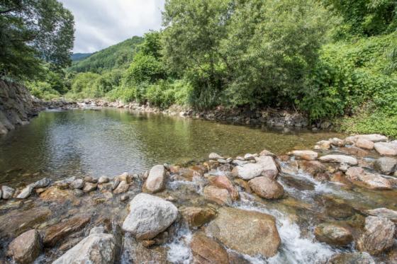 민주지산, 삼도봉, 석기봉, 각호산 등 이름만 들어도 쟁쟁한 영동의 명산들이 만든 깊은 골 다라 흐르는 물한계곡은 물이 하도 차 ‘한천’이라는 이름이 붙은 마을 상류에서붑터 시작해 무려 20여km나 물줄기를 이어간다, 원시림이 잘 보존된 계곡 주변은 우리나라에서 손꼽히는 생태관광지로 많은 야생동물이 서식하고 있다. 황룡사에서 용소(무지개소) 구간이 가장 아름답다는 평 때문에 여름이면 더위를 피하러 찾아온 관광객이 인산인해를 이룬다. 옥소폭포, 의용골폭포, 음주암폭포 등 소리만 들어도 시원한 폭포들과 맑디맑은 소(沼)는 푸르른 숲과 어울려 천혜의 휴양지라 할 만하다.