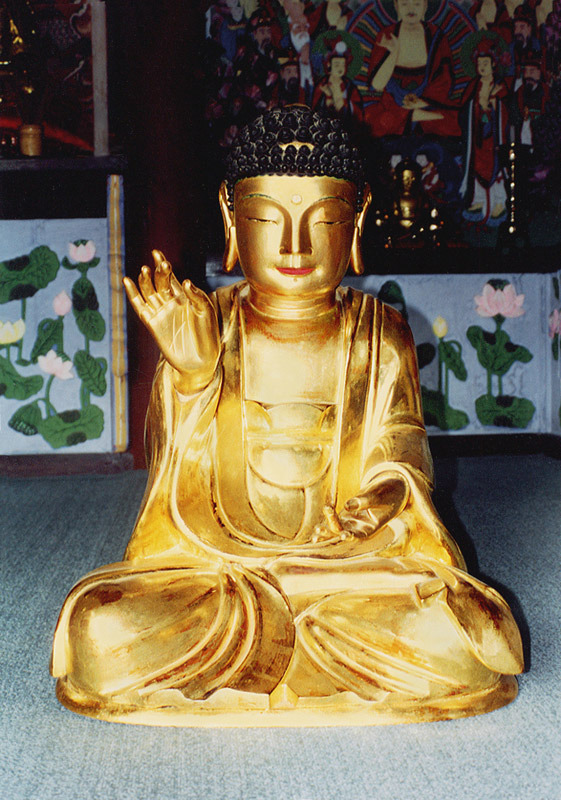 채운사의 대웅전에 있는 불상이다. 한국전쟁 때 인민군이 3번이나 불태우려 했지만 타지 않자 겁을 먹고 물러갔다는 일화가 전해진다. 불상은 오른손을 들어 손바닥을 밖으로 하고, 왼손은 무릎 위에 올려 설법하는 모양을 하고 있다. 불상의 제작 연대를 밝혀주는 유물이 불상 속에서 발견되었는데, 조선 경종 3년(1723)에 만들어진 것으로 밝혀졌다. 채운사는 조망이 좋아서 화양구곡의 하나인 첨성대를 한눈에 볼 수 있다.