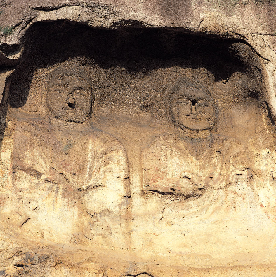 조령산으로 향하는 길목에 자리하고 있는 불상으로 보물 제97호로 지정되었다. 높이 12m나 되는 큰 암석에 감실을 마련하고 불상 2구를 나란히 앉혀놓았다. 얼굴은 둥글고 평면적이며 가늘고 긴 눈, 넓적한 입 등을 묘사하여 작게나마 미소가 번지고 있다. 코와 왼쪽 뺨이 패었으나 제 모습이 대체로 남아 있다. 어깨가 반듯하고 가슴이 편평하여 몸통은 전체적으로 굴곡이 없이 처리하여 형식화되어 있다. 법의는 한쪽 어깨에만 걸쳤으며, 도식적인 옷무늬가 무딘 조각 수법으로 묘사되었다. 이와 같이 나란히 앉은 두 불상은 한국에서는 드문 예로 보인다. 가까이에 조령삼관문과 수옥정폭포 등 명소가 많이 있다.