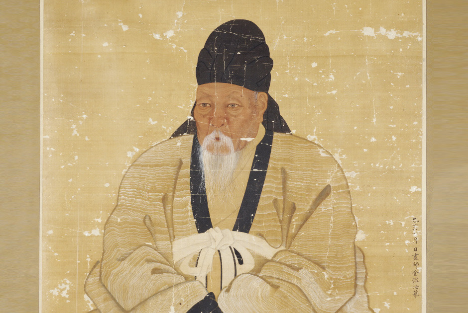 한수옹칠십구세진이라는 화제가 있고 오른쪽 아래에는기해사월일화사김진여모라는 기록이 있어 권상하가 79세 되던 1719년 김진여에 의해 그려진 것을 알 수 있다. 화가가 밝혀진 작품이며 18세기에 유행한 한림학사풍 사대부 초상의 대표적인 예로 다른 초상화에서는 볼 수 없는 흰색 물결 모양의 의문이 있는 특이한 심의가 주목된다.